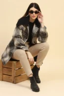 Beige Plaid Button-Down Winter Coat with Contrast Collar quantity