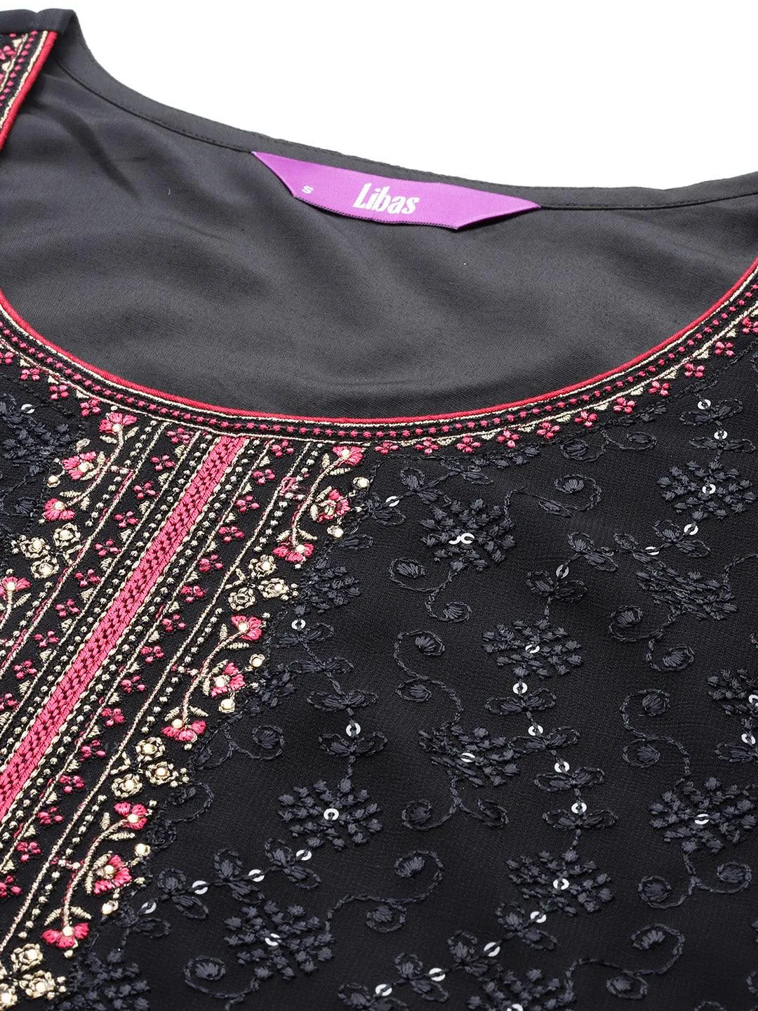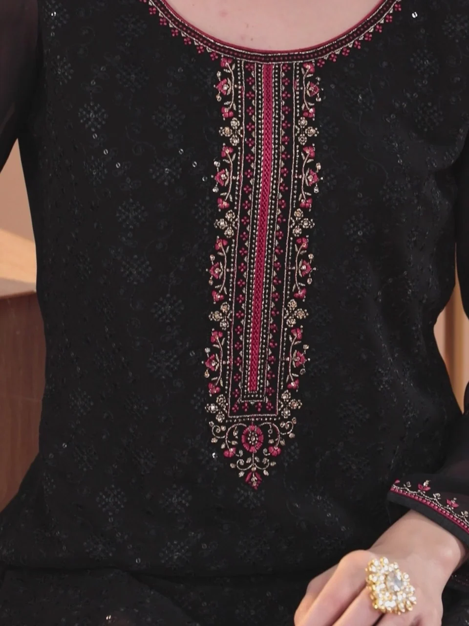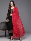Turn heads at any event with this beautiful contrasting suit set. The straight-cut kurta is crafted from flowy black georgette fabric and features elegant embroidery on the yoke/neckline and hem, along with small motifs scattered across the front. The long sheer sleeves add a delicate touch. The outfit is completed with a bold red dupatta adorned with floral embroidery and a detailed border, creating a perfect festive look.