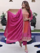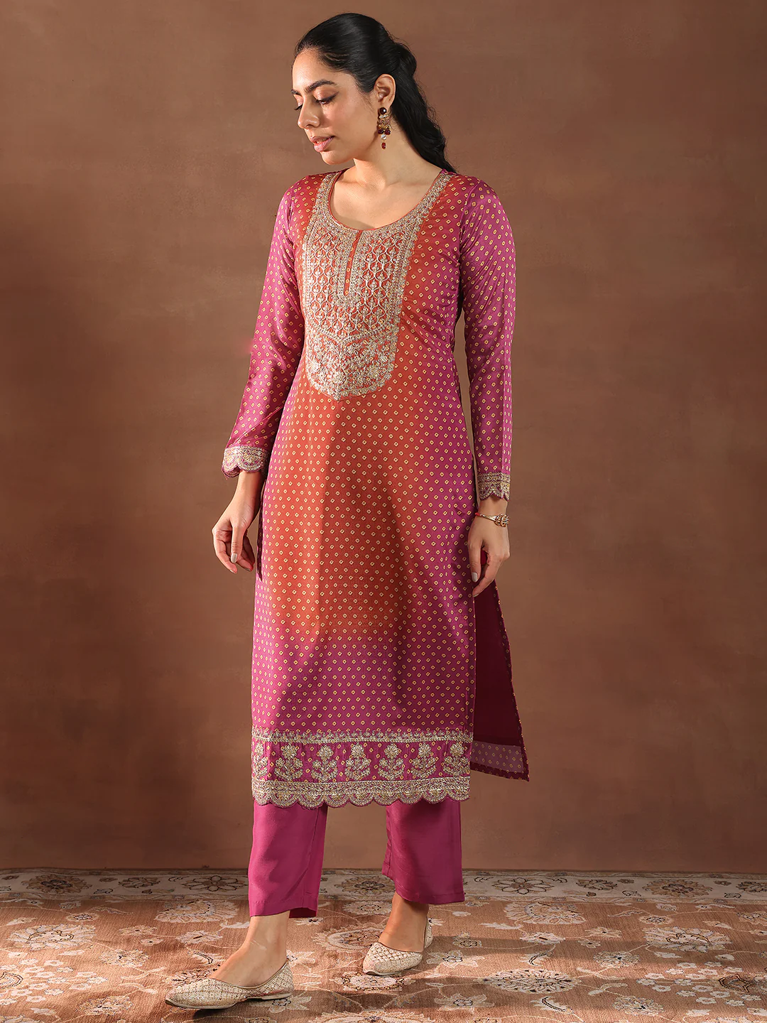 Celebrate in style with this exquisite gradient suit set that perfectly captures the festive spirit. The kurta showcases a mesmerizing ombre transition from soft orange at the top to deep magenta pink at the hem, adorned with an all-over gold dotted pattern. The yoke features heavy gold zari embroidery, and the hemline is finished with a delicate scalloped embroidered border. It is paired with a solid magenta dupatta with a matching scalloped gold border and straight trousers to complete the look.