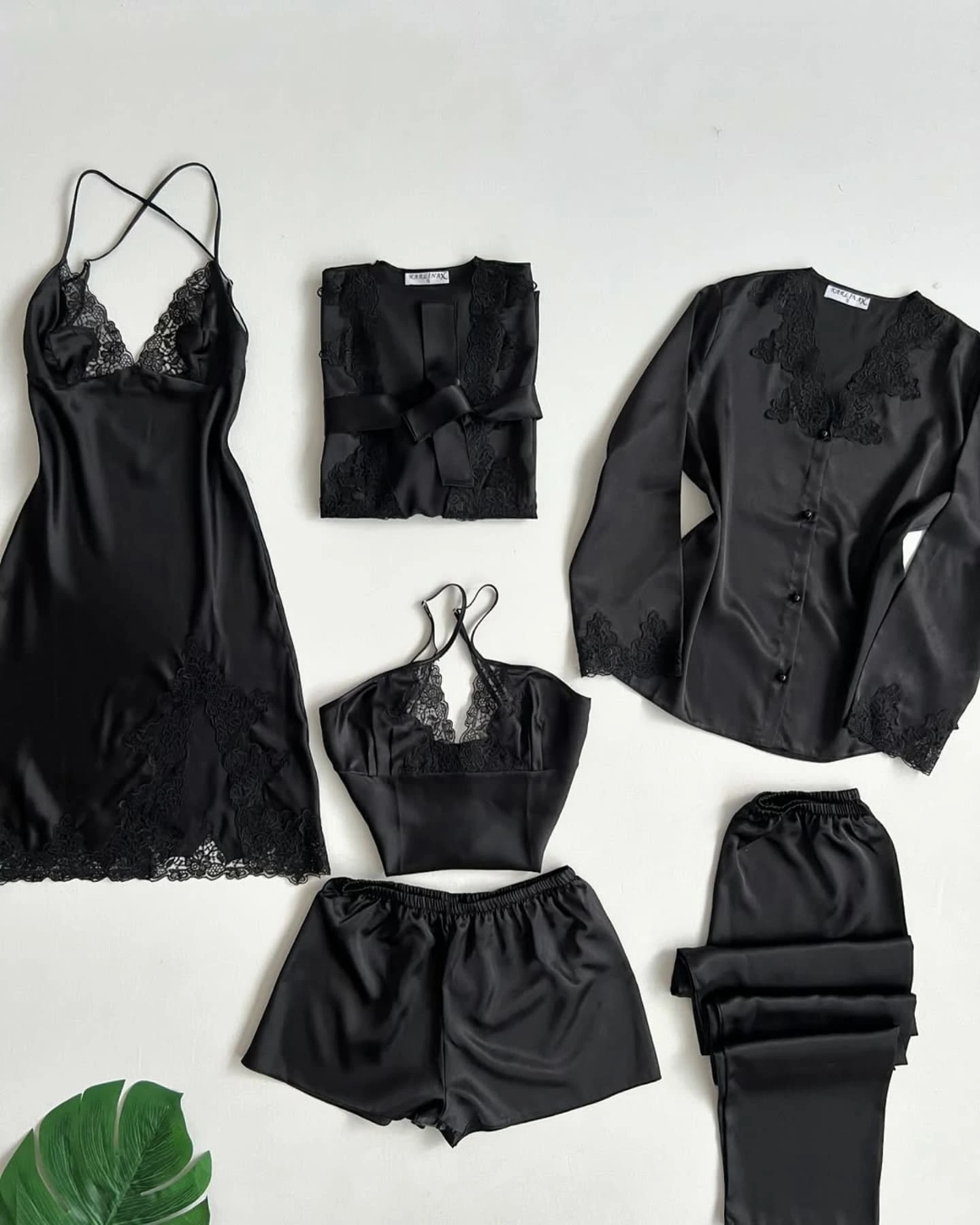 Upgrade your nightwear collection with this versatile and luxurious 7-piece satin set. Designed for year-round comfort and style, this bundle allows you to mix and match pieces for any weather or occasion. Each item is crafted from silky-smooth satin and finished with delicate floral lace embroidery on the hems and necklines. Whether you want the cozy coverage of pajamas or the allure of a slip dress, this set has it all.