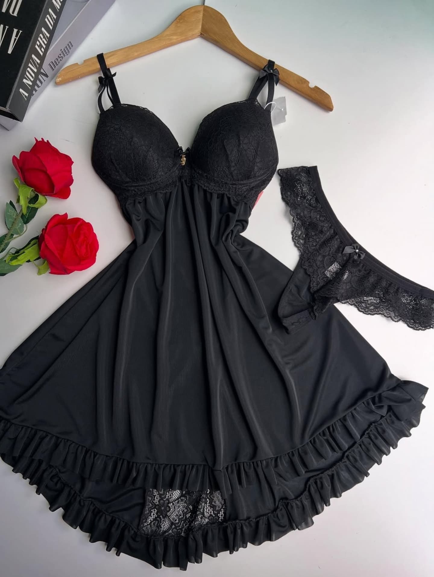 Add a touch of playful charm to your intimate wear with this adorable black babydoll set. The bodice features structured lace cups that offer support and style, adorned with cute satin ribbon bows on the straps and center. The skirt is crafted from sheer mesh fabric that flows beautifully into a flirty ruffled hem, creating a fun and bouncy silhouette. It comes with a matching lace thong/panty to complete the seductive look.