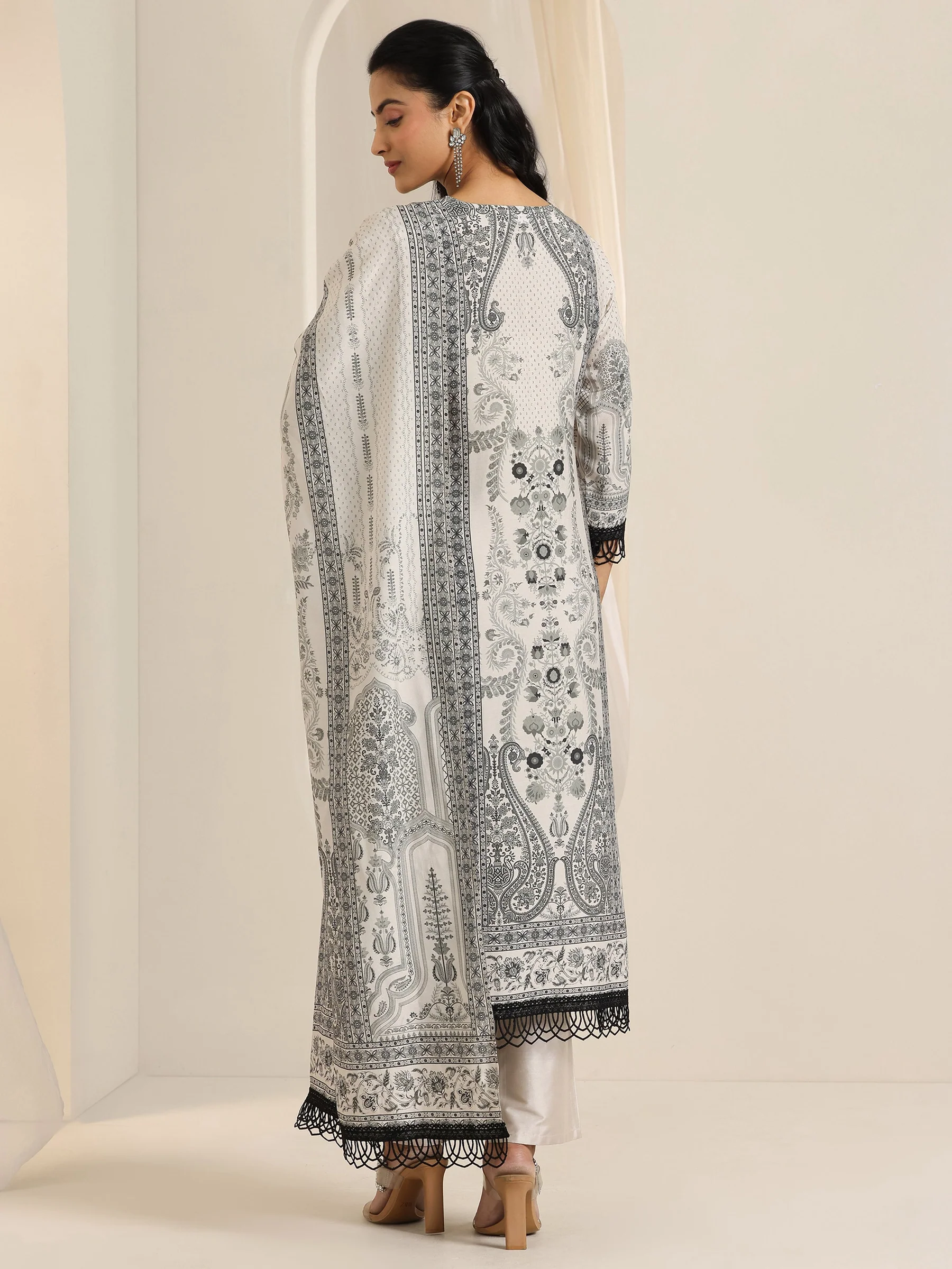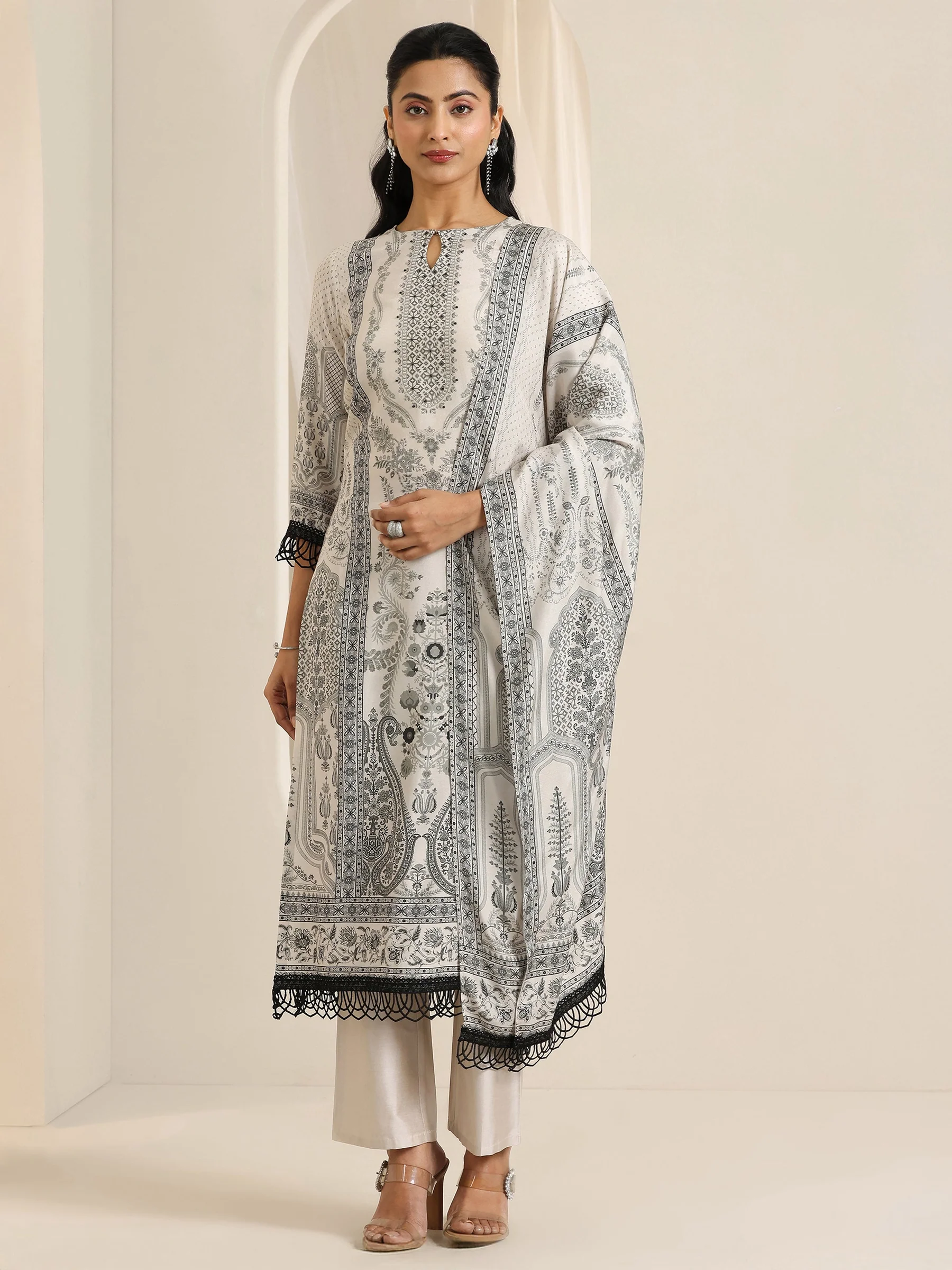 This sophisticated suit set is a perfect blend of tradition and modern style. The kurta is designed in a soothing off-white shade, covered in elaborate black paisley and floral motifs. It features a classic keyhole neckline and is accented with distinctive black crochet lace on the sleeve cuffs and the hemline for a polished finish. The look is completed with a matching printed dupatta (also with lace borders) and solid cream straight trousers.