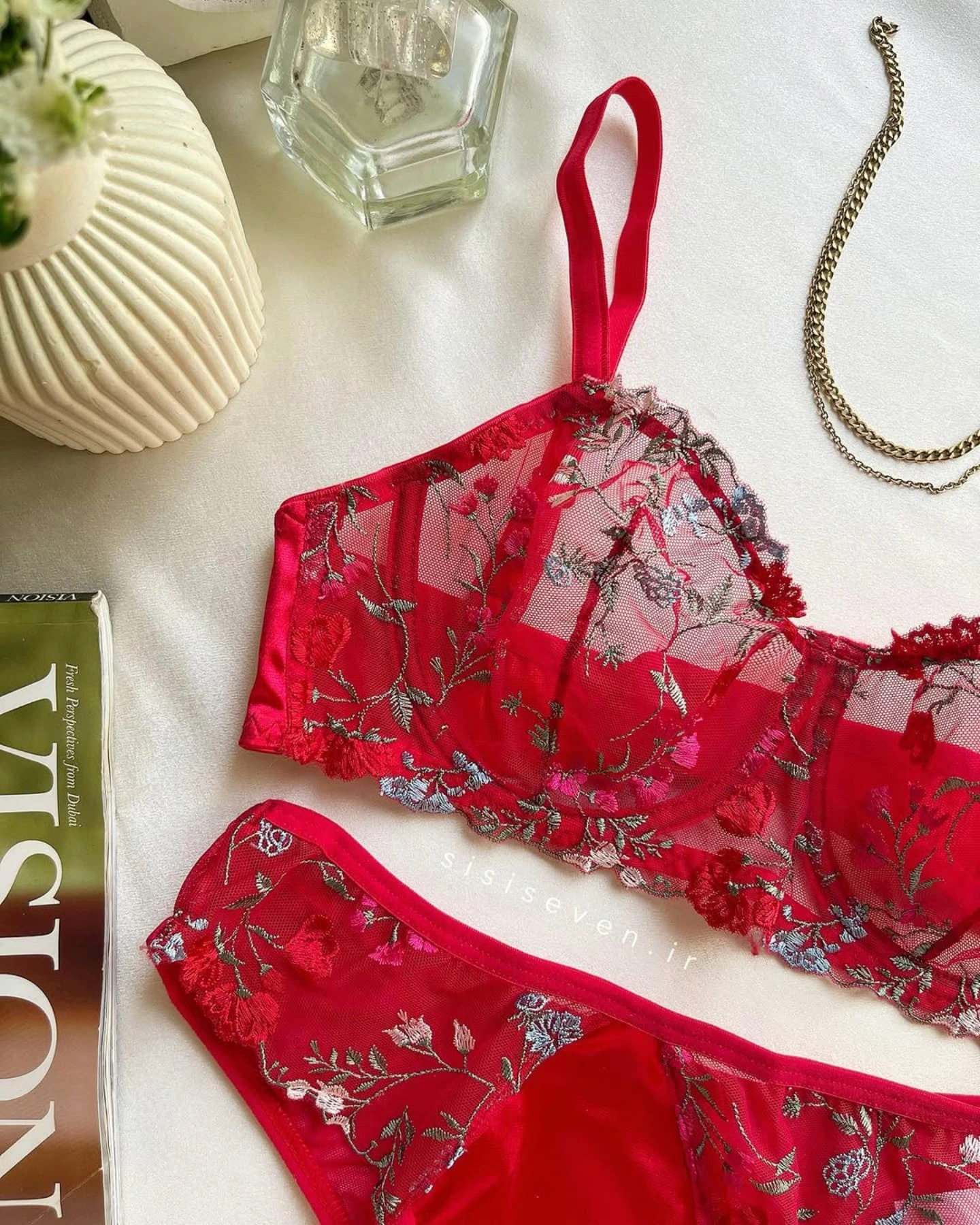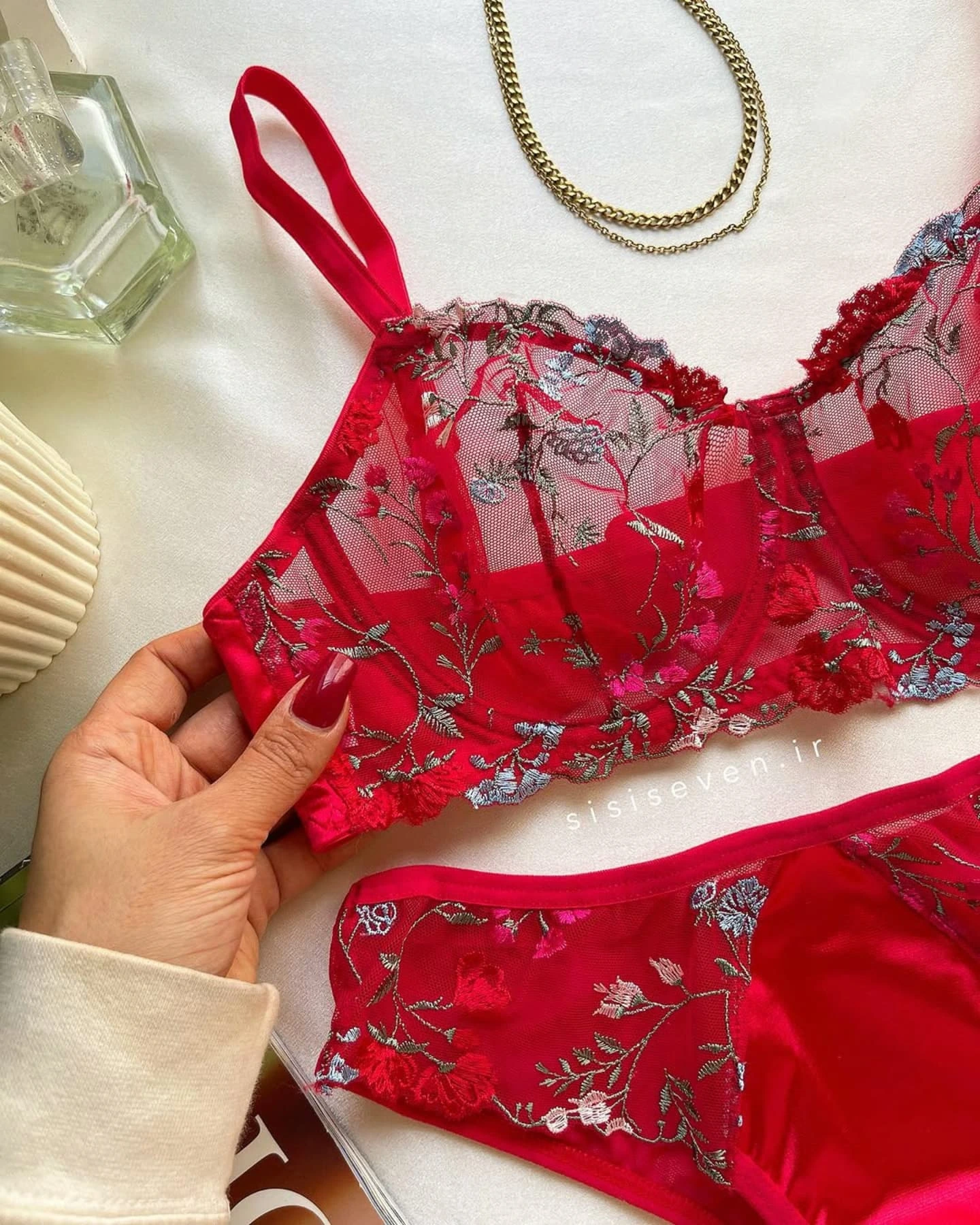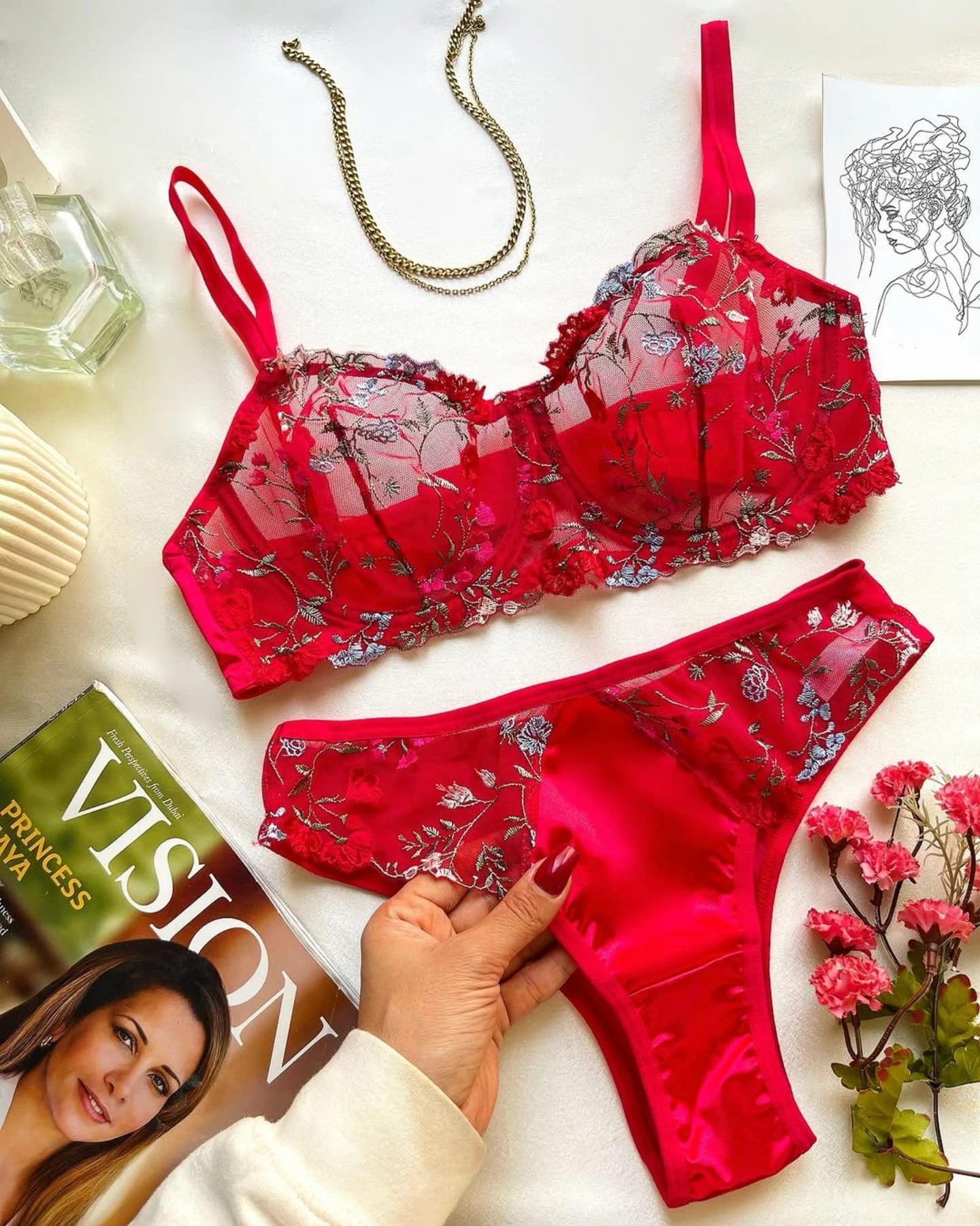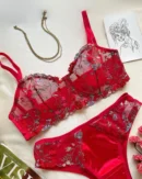 This exquisite two-piece set combines bold color with delicate artistry. The bra is crafted from sheer red mesh, beautifully embroidered with detailed flowers in shades of silver, blue, and pink, and finished with elegant scalloped edges. The matching panties offer a luxurious mix of textures, featuring sheer embroidered sides and a silky smooth satin panel in the front for comfort and style.