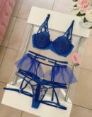 Make a bold statement with this electrifying royal blue lingerie set. The underwired bra is designed with a sexy strappy neckline and features beautiful gold/bronze floral branch embroidery that pops against the blue fabric.