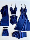 Elevate your nightwear collection with this versatile 7-piece satin set, designed to offer a different look for every mood. Crafted from high-quality, silky-smooth satin in a deep royal blue color, this set is perfect for brides or anyone who loves luxury. The set includes: