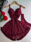 Set the mood for romance with this enchanting wine-red babydoll set. The bodice is designed with intricate floral lace cups that provide a flattering fit, highlighted by dainty satin ribbon bows on the shoulder straps and center. The sheer mesh skirt drapes softly and ends in a playful ruffled hem, adding a fun and feminine touch. It is paired with a matching lace thong/panty for a complete, coordinated look.